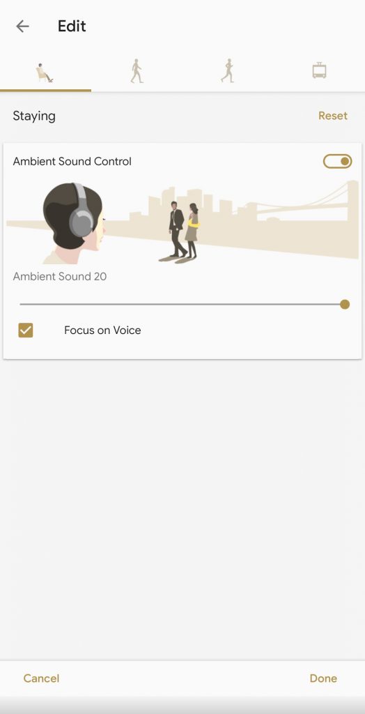 通过 App 还可以使用「自适应声音控制」(Adaptive Sound Control) 。可以让耳机自动检测你的佩戴情景进行降噪效果上相应的调整。情景分类成:静坐、行走、跑步、交通工具四种,允许用户对每种情景自行调整降噪模式。